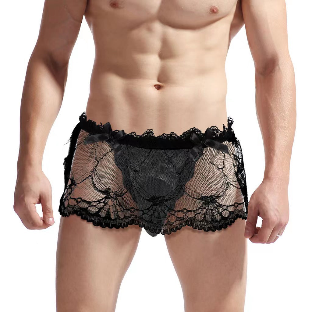 Men Crossdressing Sissy Lace High Waist Skirted G-string in Black