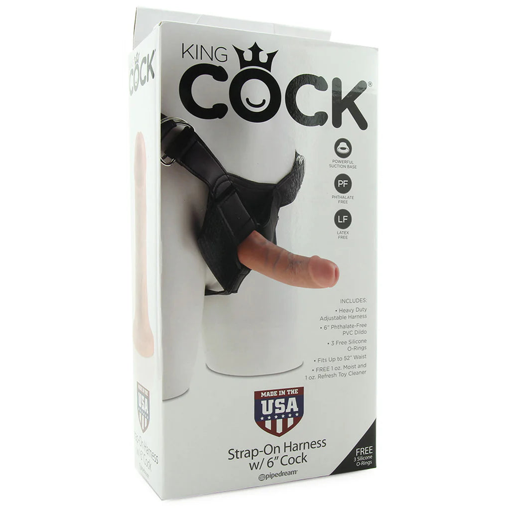 Combining a thick, filling penetration piece with a sturdy, versatile harness, Pipedream's King Cock 6" Strap-On set was designed to inspire some seriously satisfying hands-free pleasure scenarios. Perfect for pegging and girl-on-girl love, the set comes complete with one of King Cock's ultra lifelike dildos plus three sizes of silicone O-ring to fit a wide array of attachable toys.