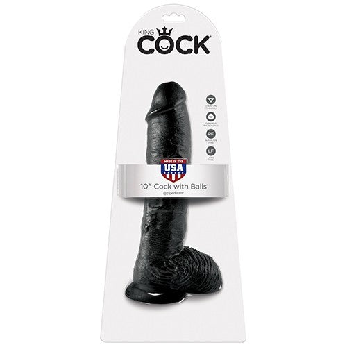 In Pipedream's safe, low maintenance PVC, the King Cock 10" cleans easily with simple soapy water or a good toy cleansing fluid. For maximum pleasure, use a great quality water-based lube to add lots of slipperiness. Made in the USA.