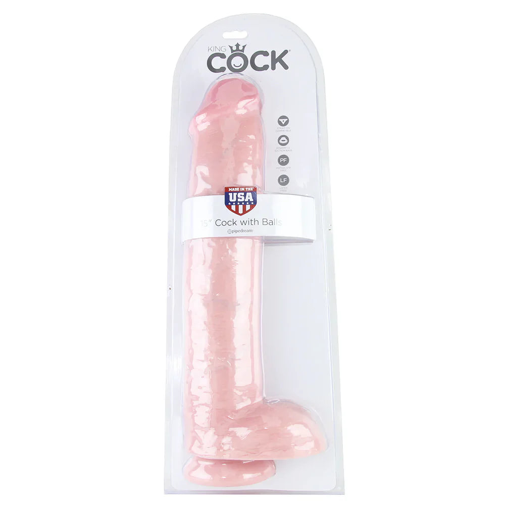 A enormous penetration piece featuring extreme-level realism, a plush, squeezable texture and perfect hands-free capability, Pipedream's King Cock 15" offers its versatile, thrillingly lifelike form to all sorts of fantasy fulfillment, foreplay and self love situations.