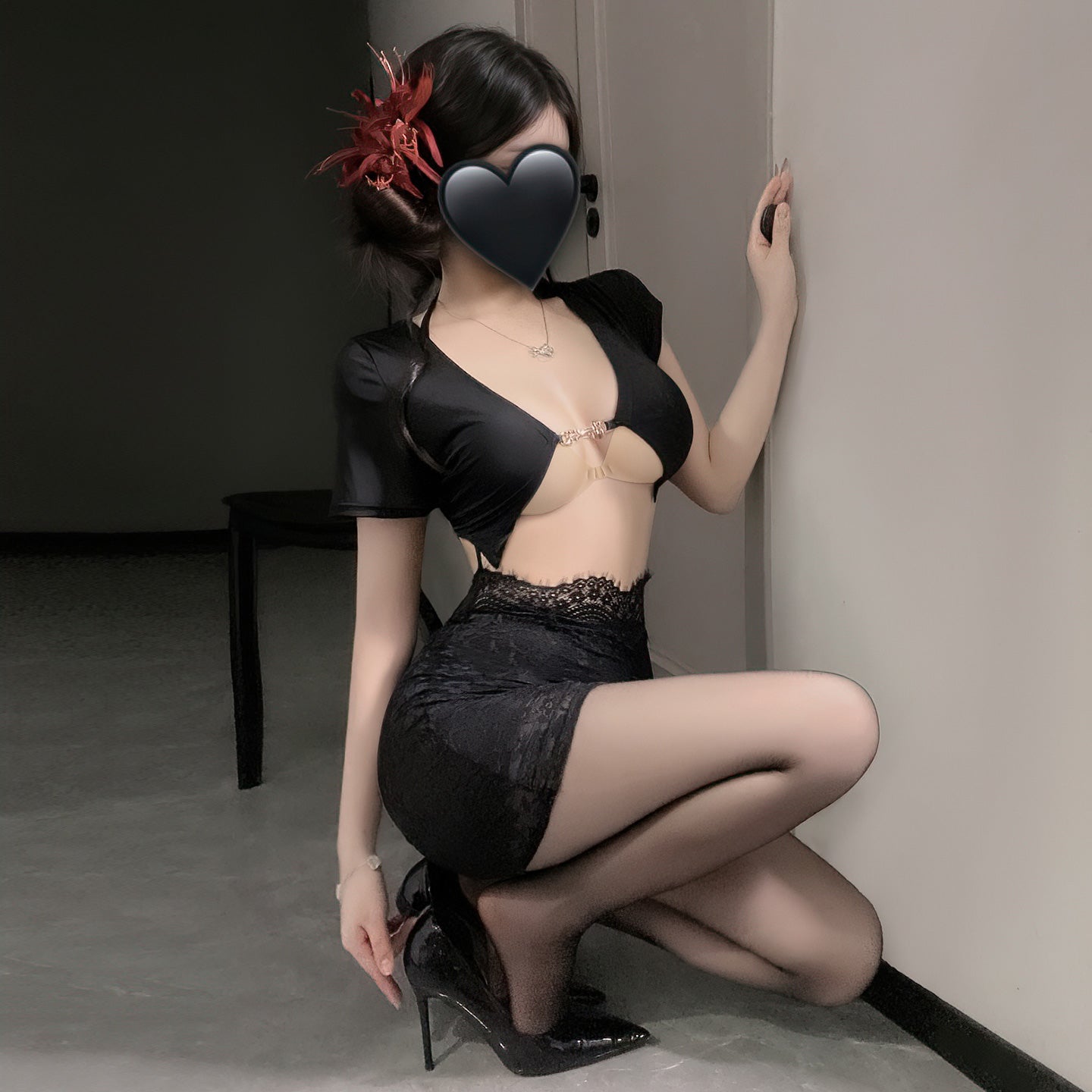 Step into your seductive side with the Private Secretary Black Lace Lingerie Set – a perfect blend of elegance, allure, and playful temptation.