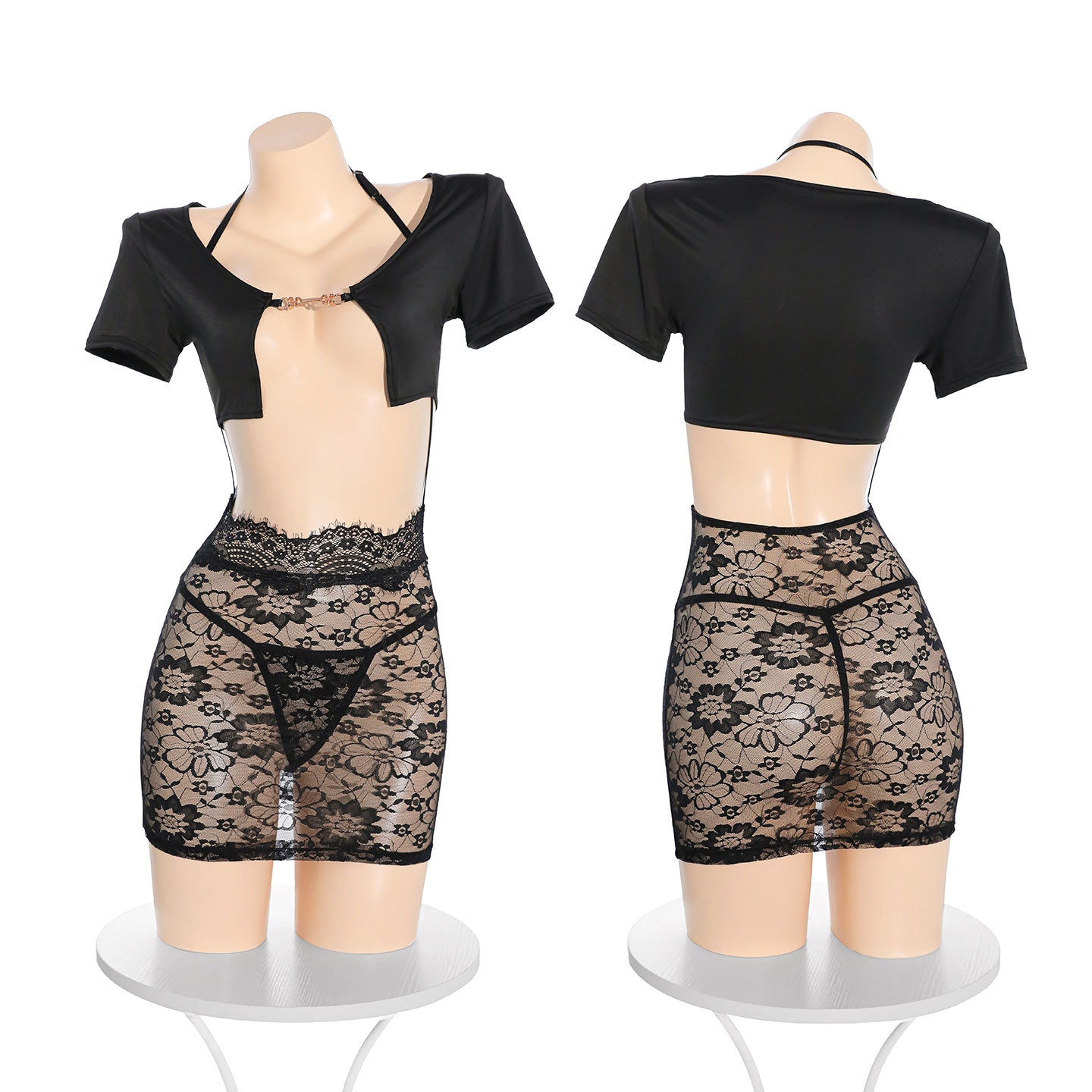Black lace and sheer details create a seductive silhouette that’s impossible to ignore – perfect for nights where you want to shine and captivate.