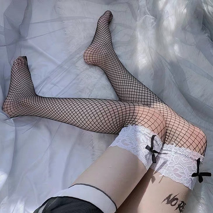 Package Includes: 1 pair of lace bow fishnet thigh-high stockings
