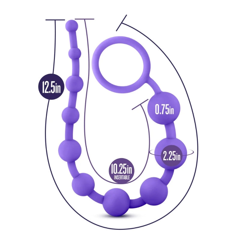 The Luxe Silicone 10 beads let you safely explore anal play. The Silicone 10 beads are exactly as they sound: 10 silicone beads graduating in size made of smooth satin silicone. The size and the loop at the end ensure easy insertion and retrieval. Our Silicone 10 Beads come in three lush colors: pink, purple and indigo. Perfect for the beginning of anal exploration, these would make an excellent gift to a lover to send a subtle hint. Ultrasilk™ smooth and made with Puria™ silicone: this toy is body safe and easy to clean! Just wash with warm soap and water, or your favorite toy cleaner, before and after every use. Pat dry with a soft towel before storing.