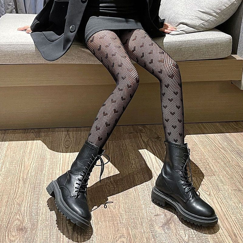 Heart Pattern: A delicate yet bold heart motif that adds a sweet, flirtatious touch to the edgy fishnet texture.
